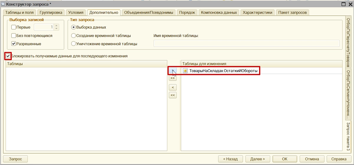 Чтобы в запросе появилась конструкция «ДЛЯ ИЗМЕНЕНИЯ» с нужными нам ограничениями, необходимо использовать конструктор запроса. На вкладке «Дополнительно» нажмите галку для блокировки данных и перенесите вправо таблицы, которые нужно заблокировать. Блокировка всех таблиц избыточна, поэтому выбирайте конкретные источники данных из запроса.
