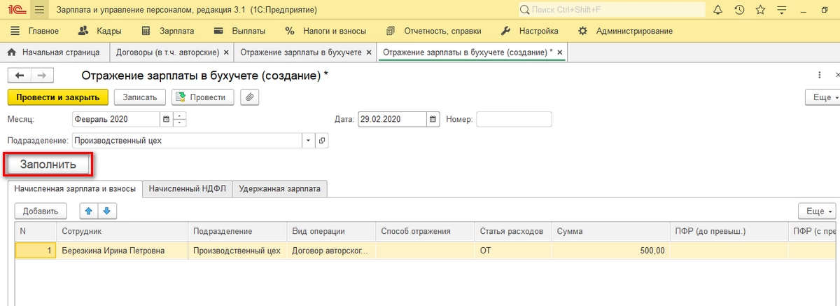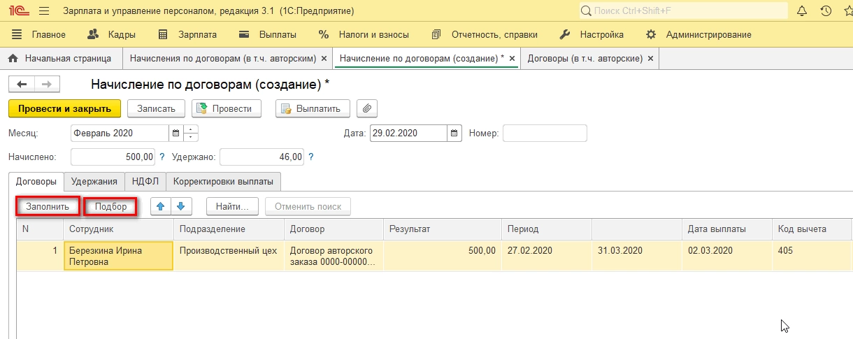 Выдачу средств в межрасчетный период делают через «Начисление по договорам (в т.ч. авторским)» в разделе «Зарплата». Делаем новый документ и для автоматического заполнения документа рассчитанными суммами жмем «Заполнить» или «Подбор».