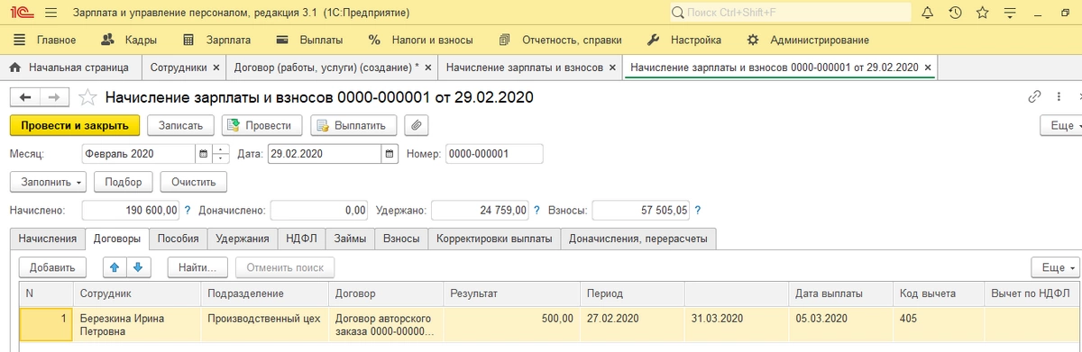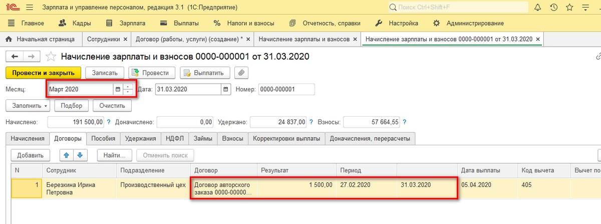 Если выплата по ДГПХ происходит в сроки выплаты зарплаты, то начисления сумм делают через «Начисление зарплаты и взносов». Доходы по договорам ГПХ рассчитываются на закладке «Договоры».