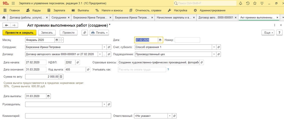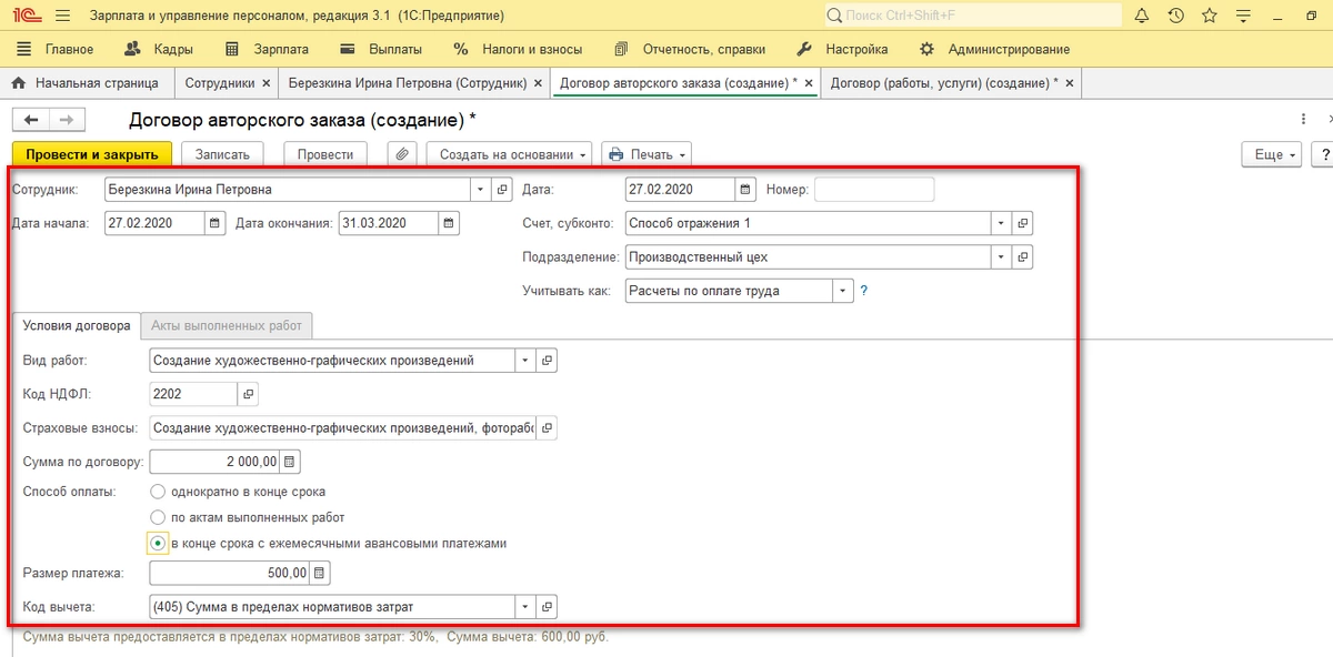 Для завершения работы жмем «Провести и закрыть». Если вы только в самом начале пути оформления договоров ГПХ или планируете поменять процессы, наши эксперты по кадровому учету в 1С помогут разобраться в деталях автоматизации оформления договорных отношений в 1С:ЗУП.