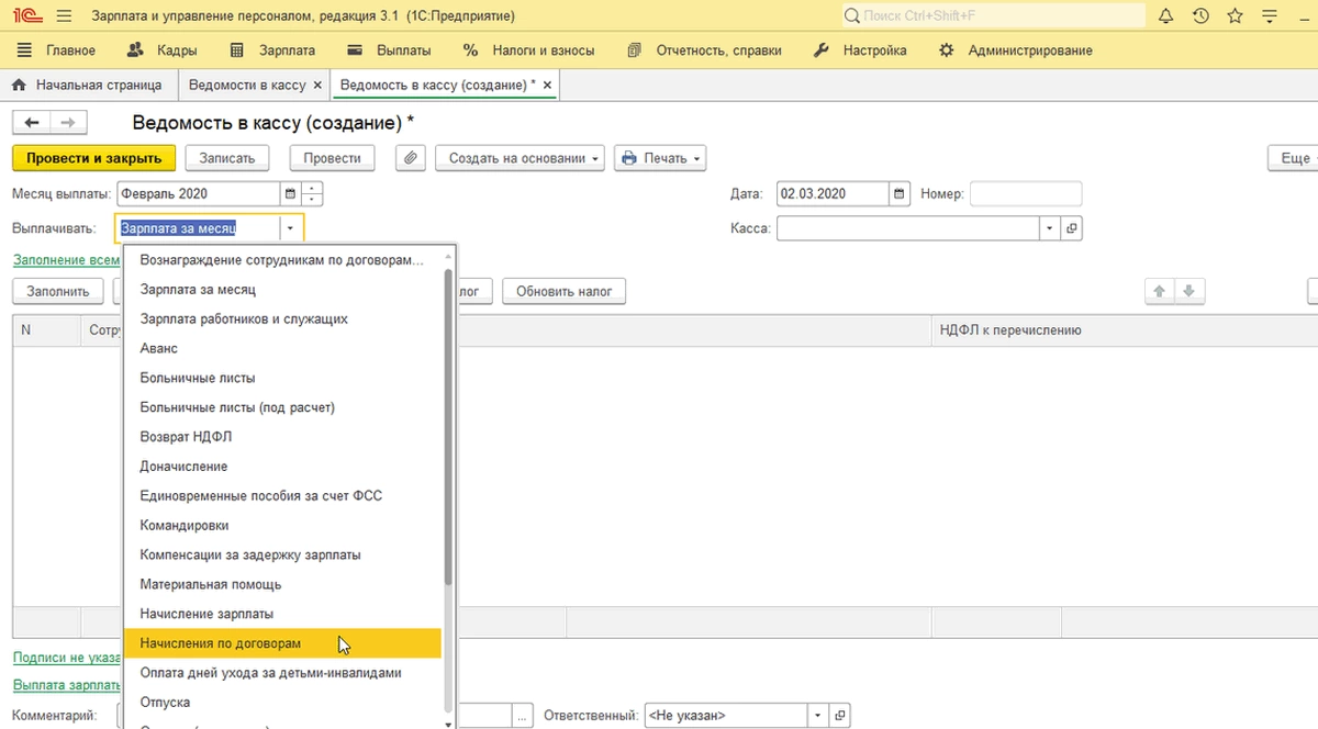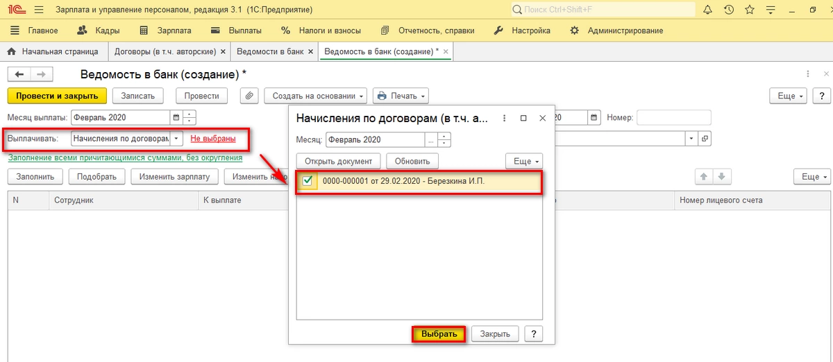 Далее создаем документ «Ведомость в банк/на счета/в кассу» со значением выплаты «Начисления по договорам» и заполняем полученными суммами через «Заполнить» или «Подбор».