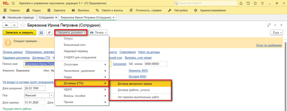 Рассмотрим пример оформления ГПХ на сотрудника, оформленного по ТД. Выбрав его в карточке, оформляем нужный вид договора.