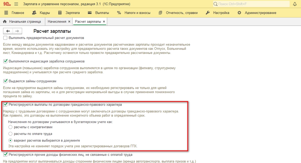 Для настройки возможности работы с ДГПХ необходимо установить флаг регистрации выплат по ним в меню «Настройка-Расчет Зарплаты».