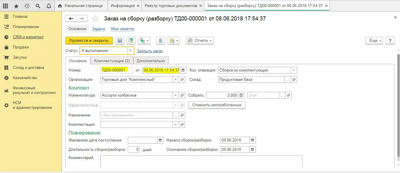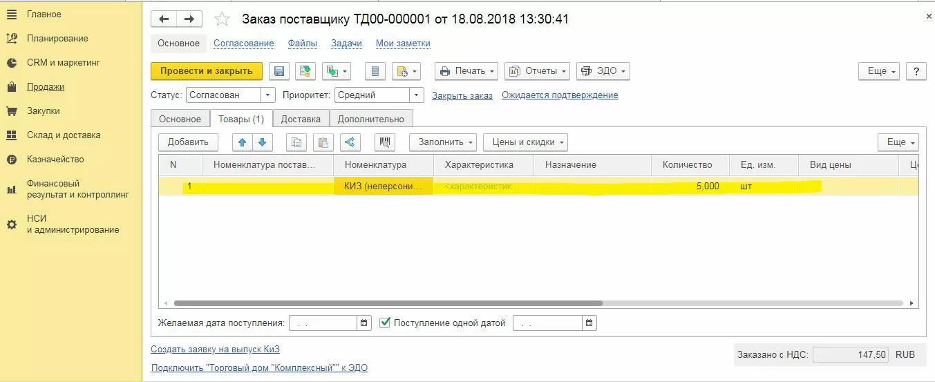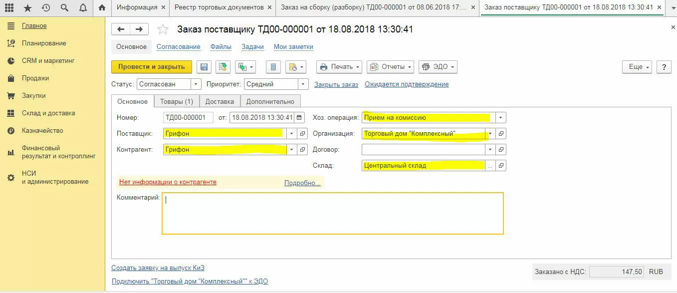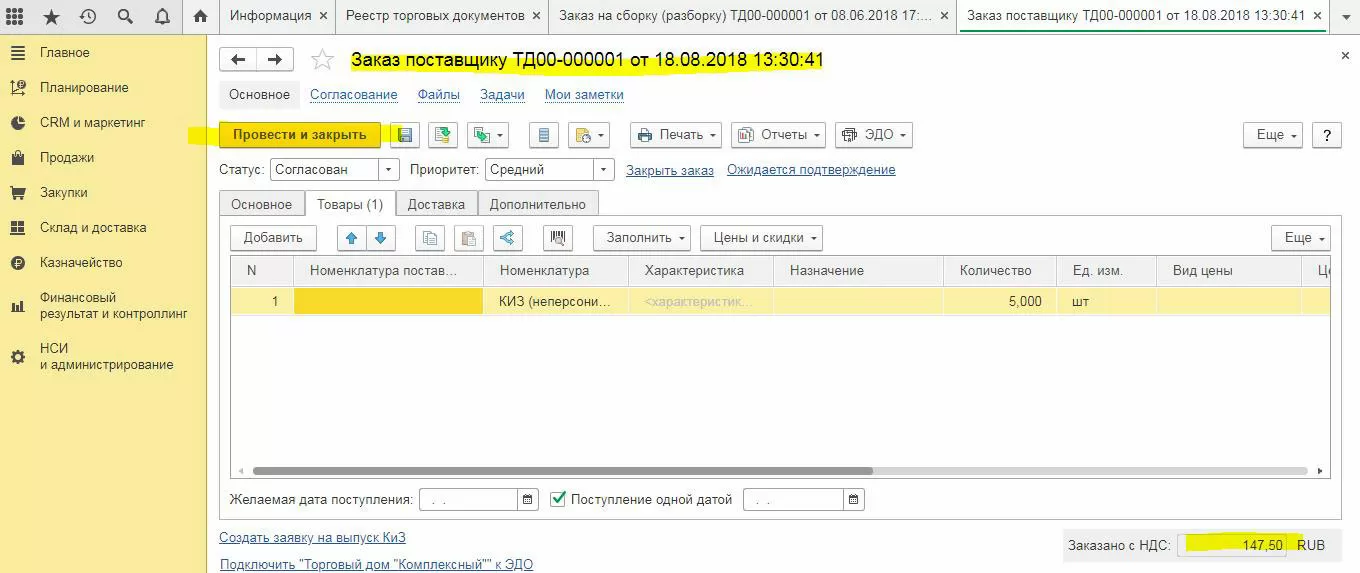 В верхней части каждого документа можно увидеть кнопки типа «Провести и закрыть», либо же «Записать и закрыть». Документ «Заказ Поставщику» может вносить изменения в состояние расчета с поставщиками, в состояние текущих заказов и складских остатков, так как имеет свойство проведения. Для того чтобы это произошло, у документа должен быть статус «проведен».