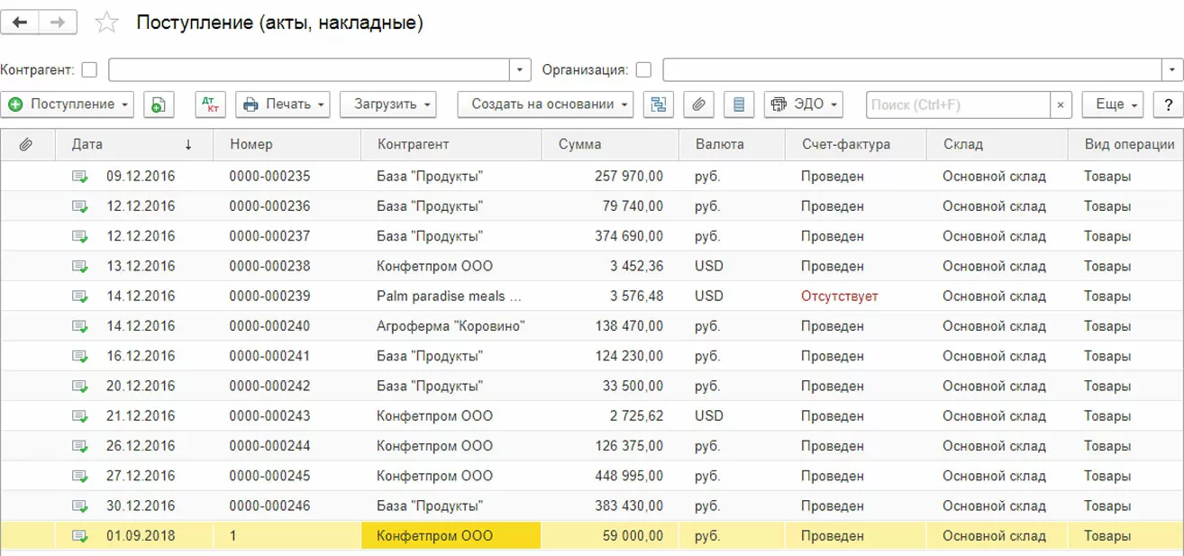 Чтобы просмотреть весь перечень документов либо документы определенного типа в 1С предусмотрена «Форма списка». Данные списки позволяют делать отбор по необходимым документам, а также быстро изменять, либо искать данные.