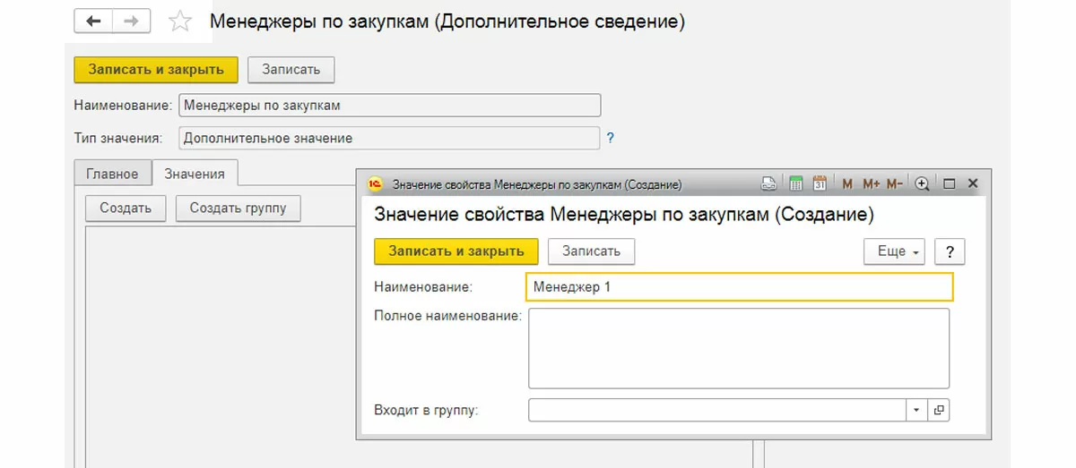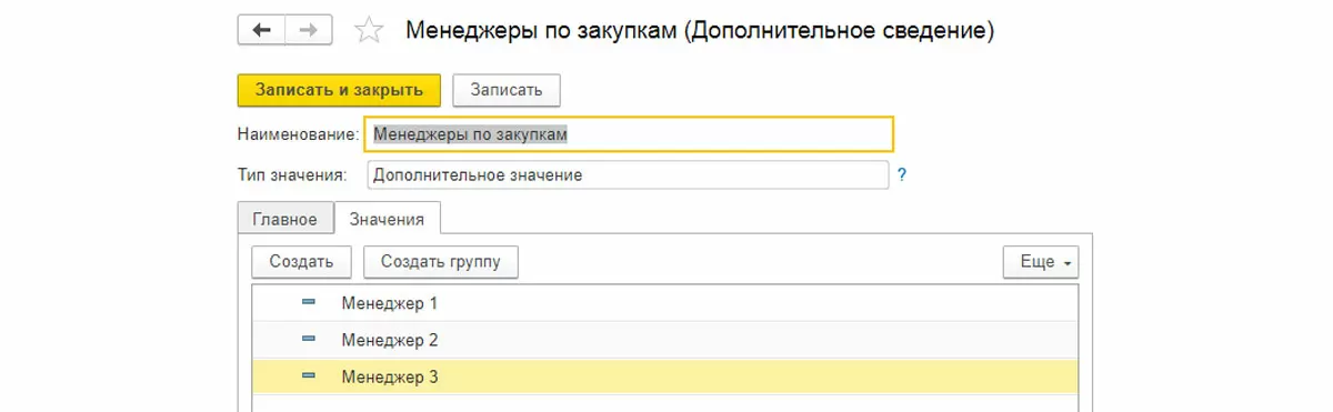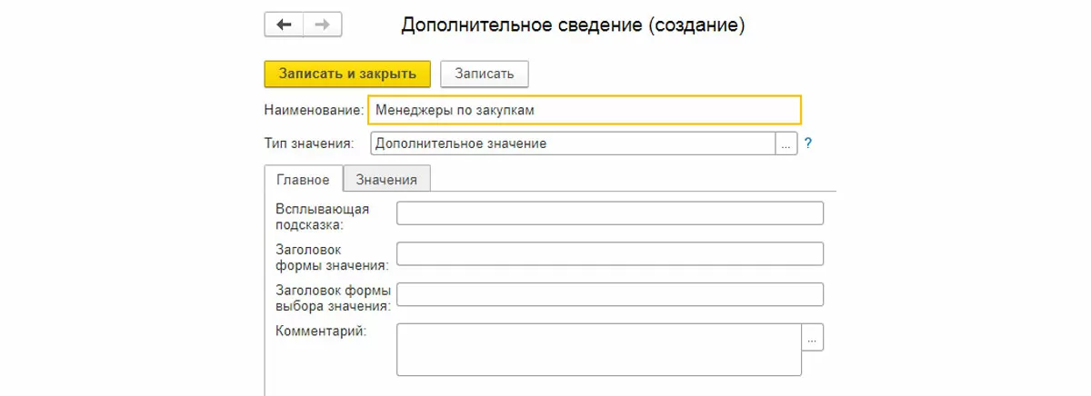 Далее переходим на вкладку «Значения», и при помощи кнопки «Создать» заполняем нужные нам значения сведений.