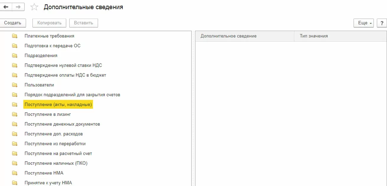 Перед нами появляется список документов, которым мы можем добавить дополнительные сведения. Например, нам нужно добавить сведения в документ «Поступление (акты, накладные)». Выделяем нужный документ и нажимаем кнопку «Создать».