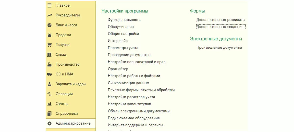 В форме «Общие настройки» выбираем вкладку «Дополнительные реквизиты и сведения» и ставим галочку в одноименном поле. Затем из меню «Администрирование-Формы-Дополнительные сведения».