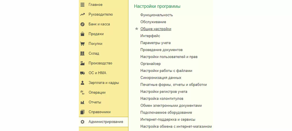 Пользователь может добавлять в документы дополнительные сведения, не меняя конфигурацию. Назначать документам дополнительные сведения может только пользователь с полными правами. В качестве примера рассмотрим, как добавить дополнительные сведения в «Заказ поставщику». Сначала заполним настройки. Для этого заходим в меню «Администрирование-Общие настройки».