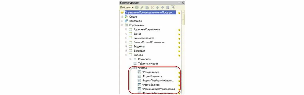 Для удобства пользователя, чтобы можно было спокойно просматривать и изменять данные в документах, программа поддерживает несколько форм одного и того же документа. Также 1С генерирует все необходимые для документа формы. Разработчики имеют возможность конфигурировать различные формы необходимых им документов самостоятельно. Для того чтобы просмотреть формы документа необходимо зайти в конфигуратор системы и в окне конфигурации выбрать нужный объект, раскрыть его ветку, и именно она отображает все формы документа.