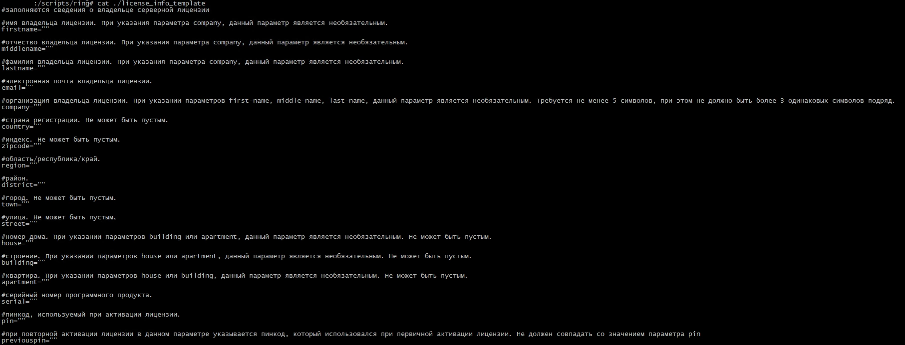 cp /scripts/ring/license_info_template /scripts/ring/serverlic - Вносим в новый файл (serverlic) по шаблону регномер, пин-код(ы) и информацию о владельце – данные вводим между кавычек. Каждая переменная имеет подробное описание.