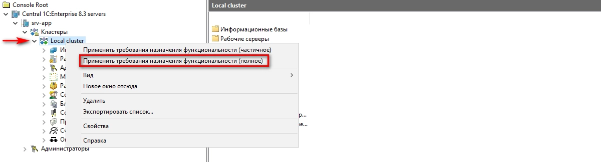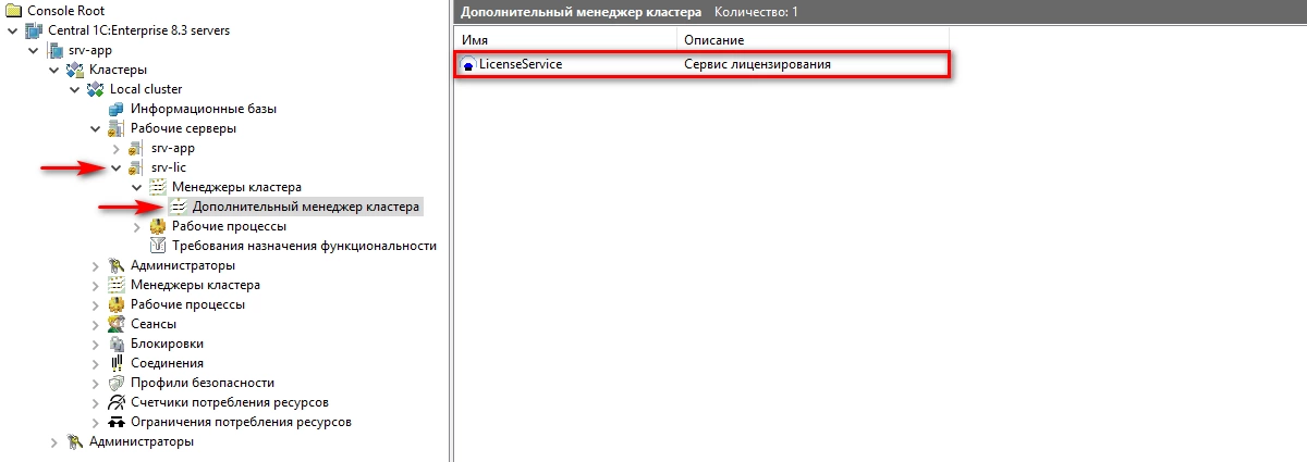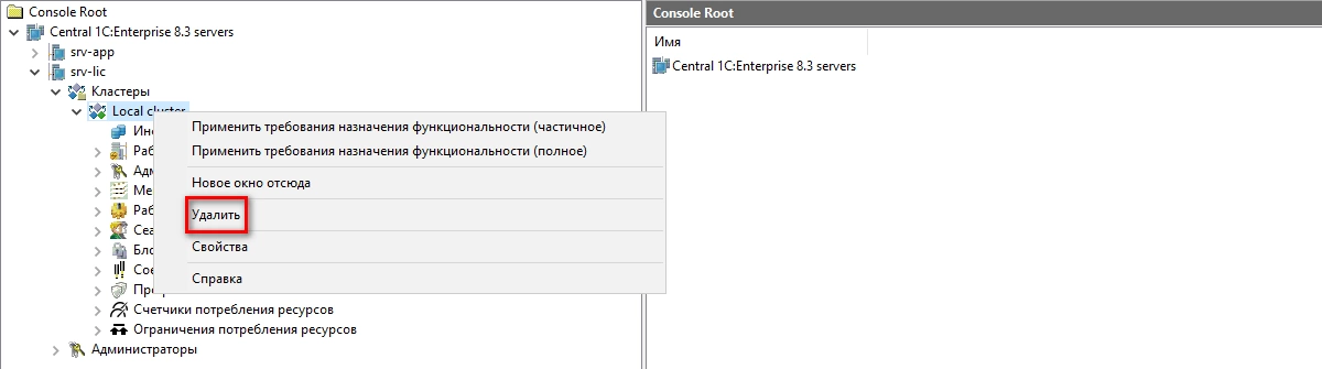 - Через консоль администрирования 1С удаляем автоматически созданный кластер на сервере лицензирования.
