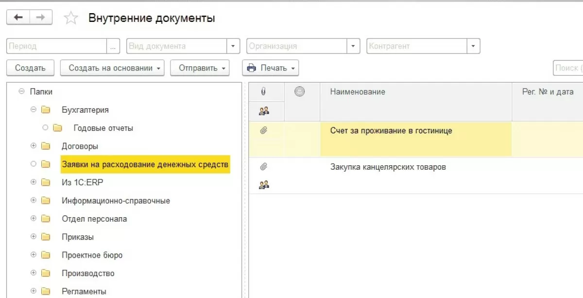 - Внутренний документооборот в 1С. В этом разделе хранятся все ваши документы и приказы, служебные записки и счета, договоры и пр. Просмотреть все документы списком вы можете в любой момент, в общем журнале;