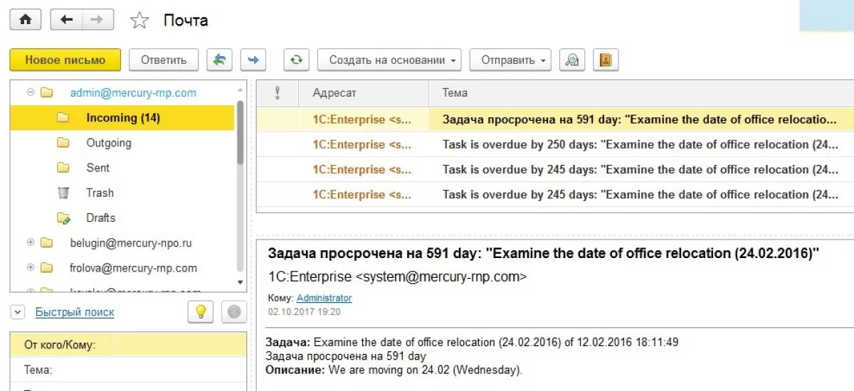 - Почта. В 1С:Документооборот есть встроенная почта. По своим функциям она идентична любой почтовой программе, но лучше защищена. Встроенная почта не даст вашим внутренним письмам перейти на внешний сервер;