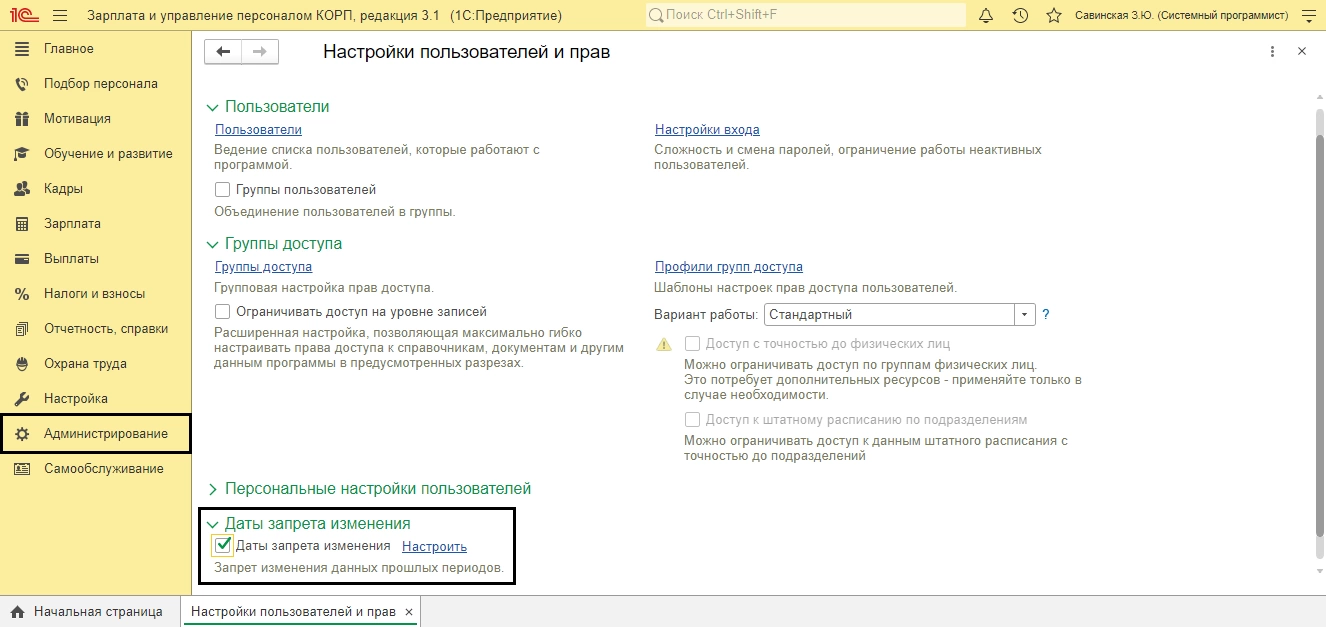 Как в ЗУП настроить ввод перерасчета отдельным документом мы упоминали выше. Рассмотрим, как во избежание ситуации случайного перерасчета документов прошлого периода, установить дату запрета редактирования.