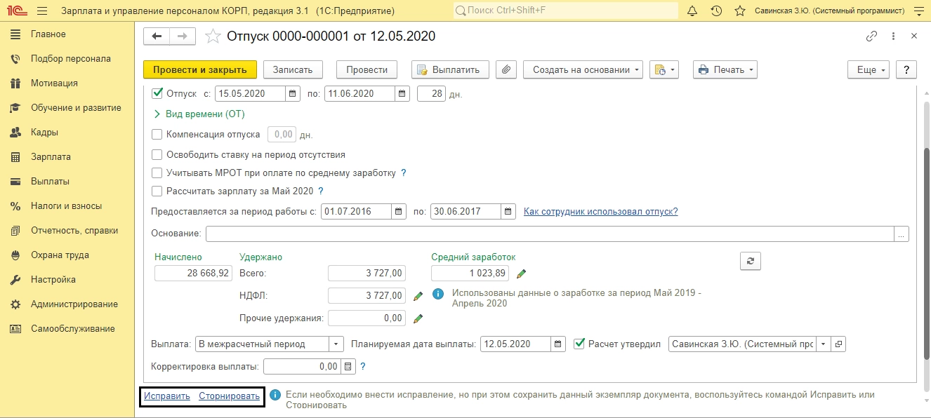 Нажмите «Исправить» и в новом документе «Отпуск» перенесите дату окончания отпуска, на количество дней больничного.