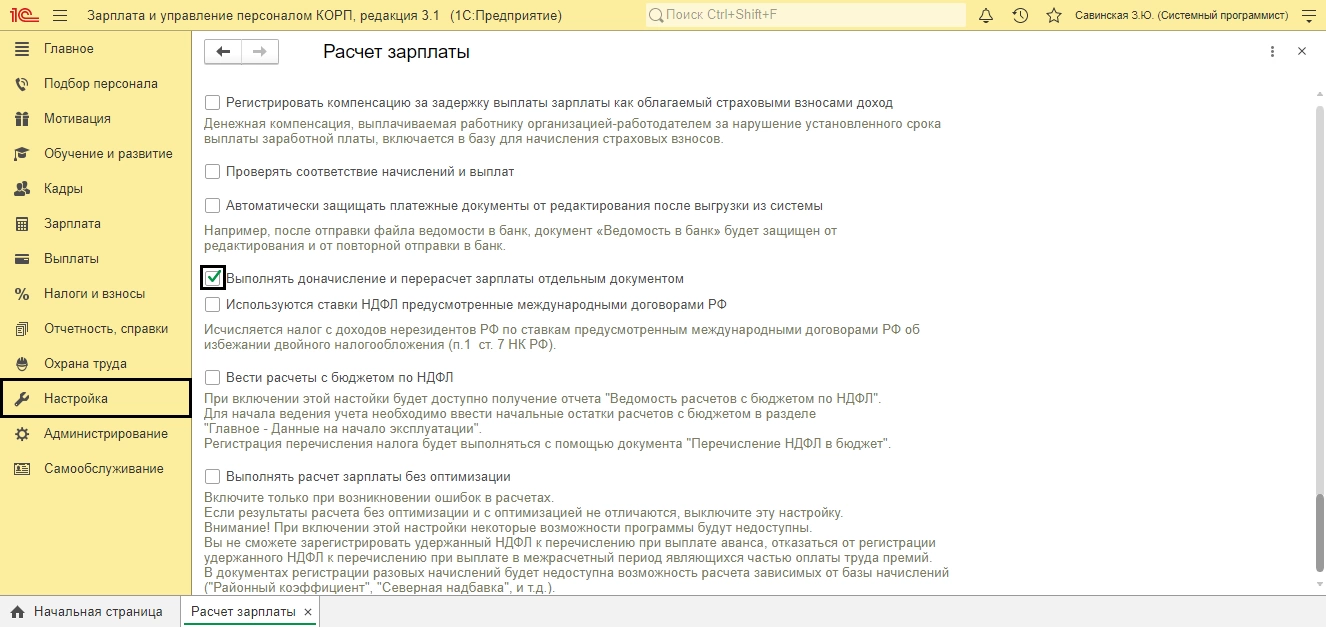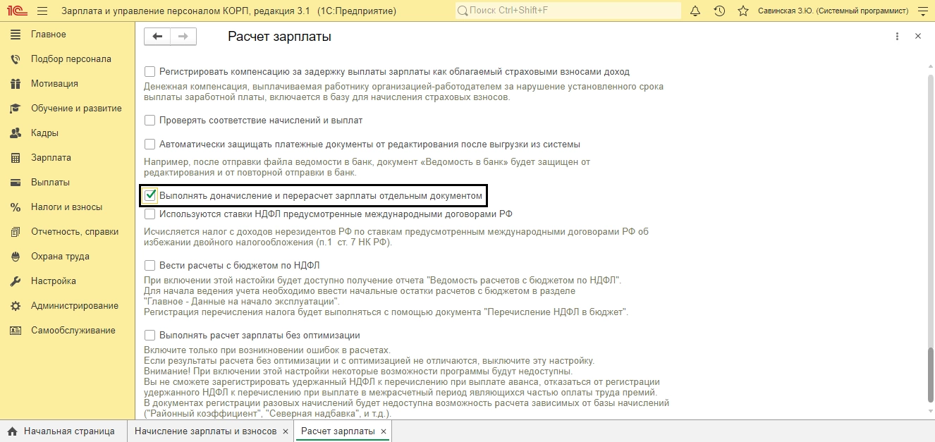 - Установить настройку ввода доначислений и перерасчетов отдельным документом.