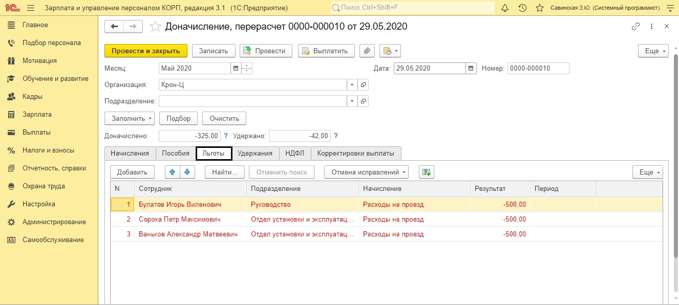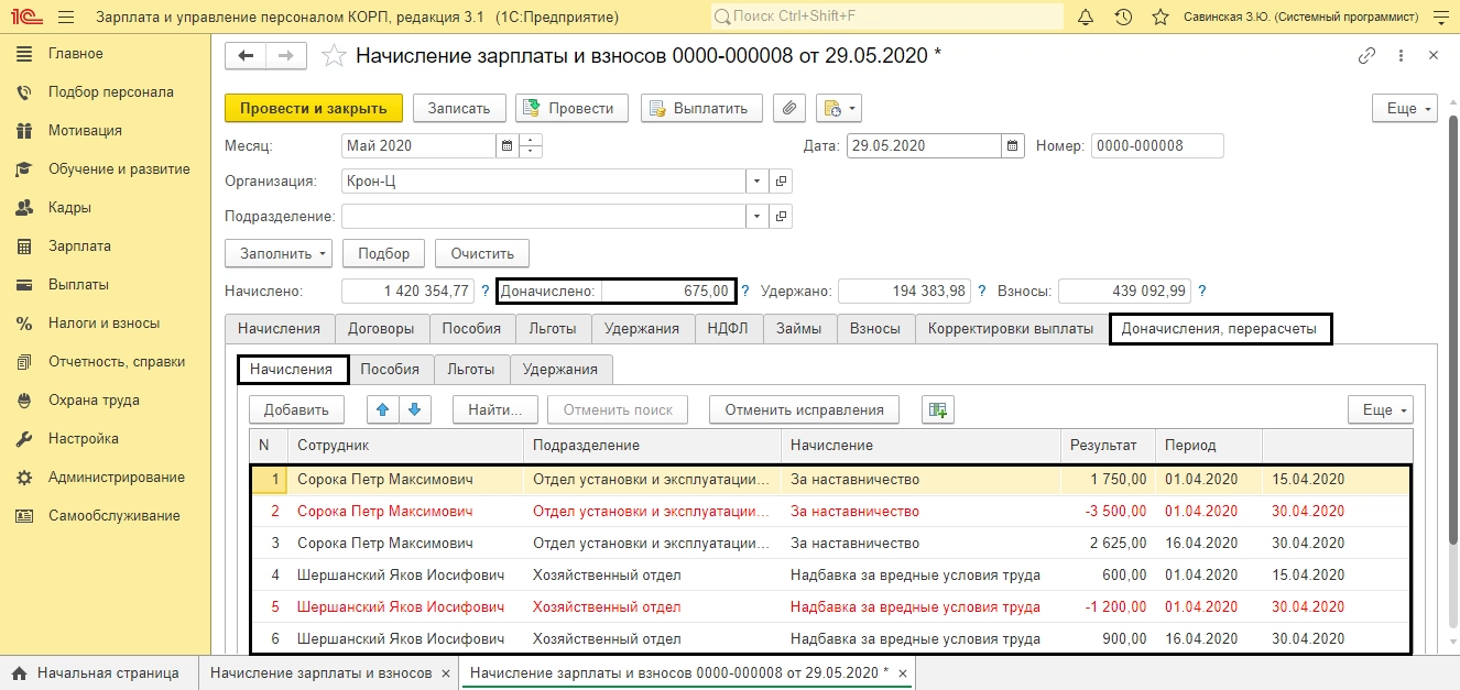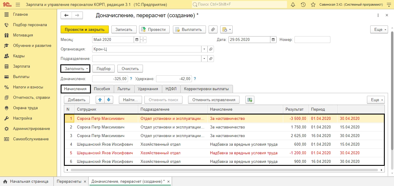 Откроется документ «Доначисление, перерасчет». При необходимости измените месяц выполнения перерасчета. На вкладке «Начисления» отображены сотрудники и выполненный перерасчет начислений. Красным (минус) начисление прошлого периода, черным (плюс) начисление текущего периода с учетом изменений.