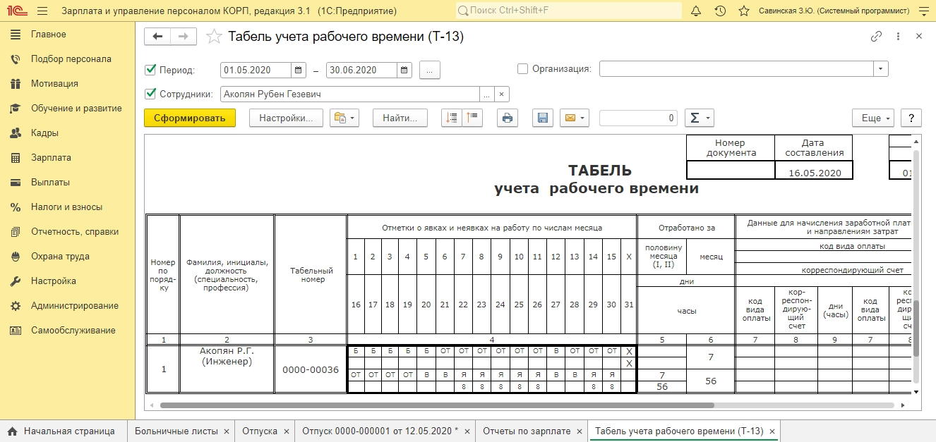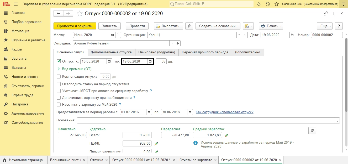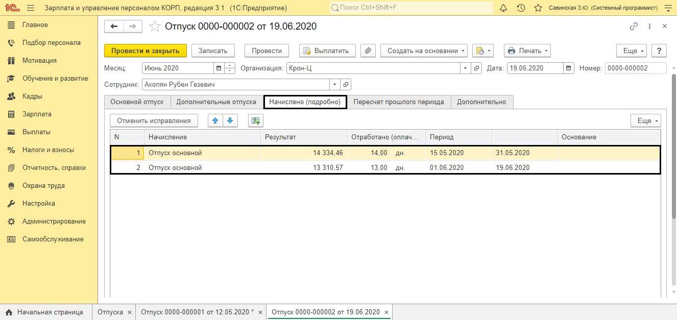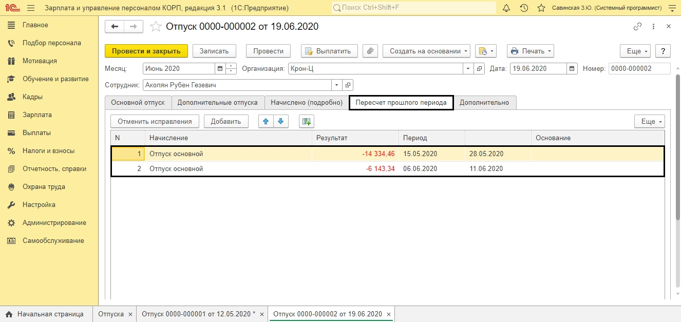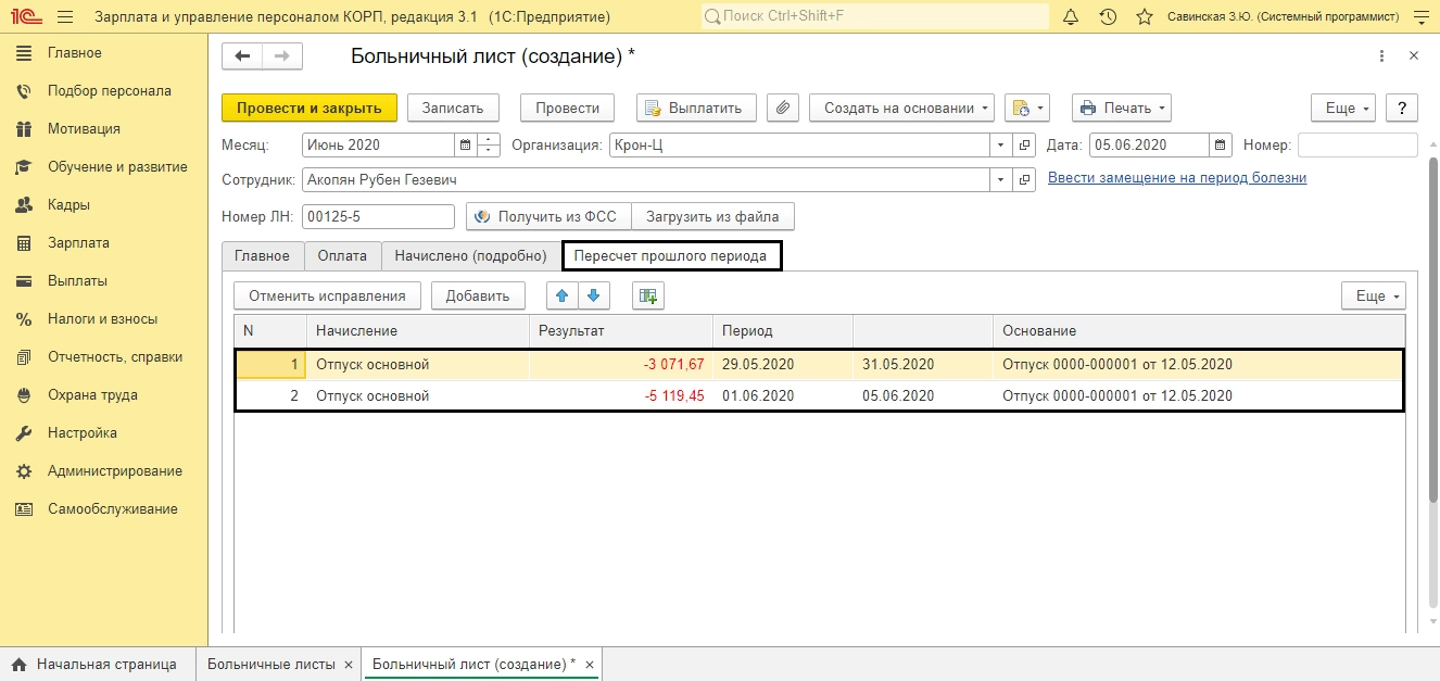 В результате на вкладке «Пересчет прошлого периода» сторнируется начисление отпуска, на даты введенного ранее больничного, отдельно по периодам (май, июнь).