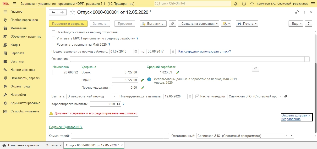 Пользователь может внести изменение в документ «Отпуск» – продлить дни отпуска на даты болезни сотрудника (при предоставлении больничного листа), при исправлении ошибки в указании даты отпуска, расчета среднего заработка и т.п.