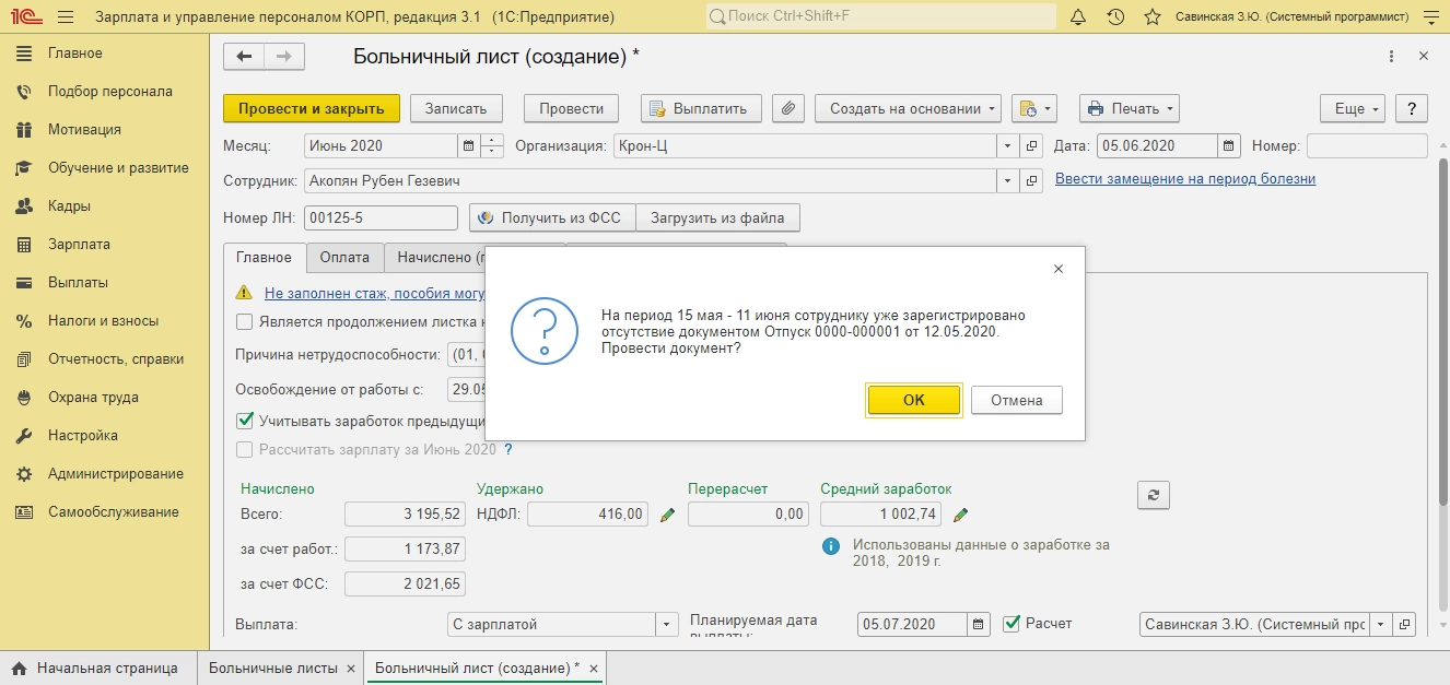 При проведении документа отклонения (в нашем примере «Больничный лист»), пересекающегося с другим отклонением, программа предупредит об этом пользователя.