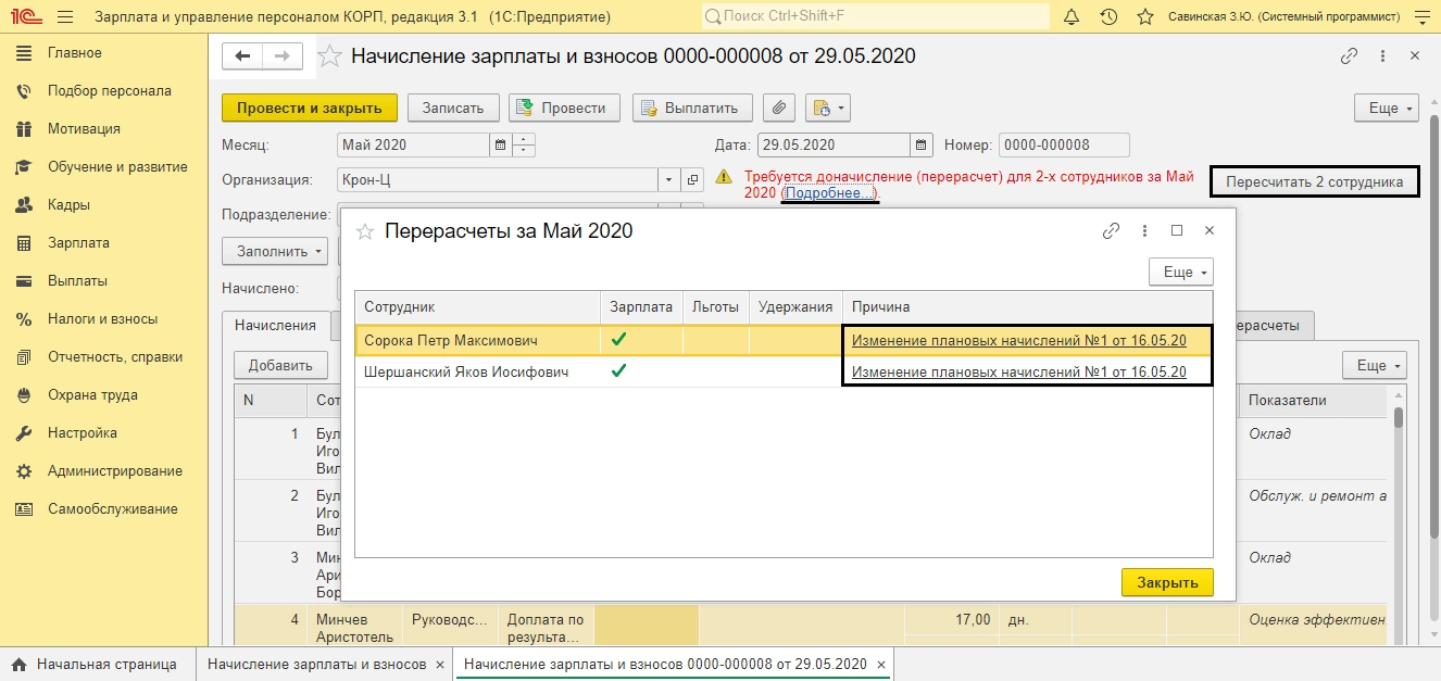 По гиперссылке «Подробнее» отобразится информация о документах, повлекших перерасчет и сотрудников, затронутых в перерасчете. В нашем примере это – «Изменение плановых начислений». Жмем «Пересчитать сотрудников».