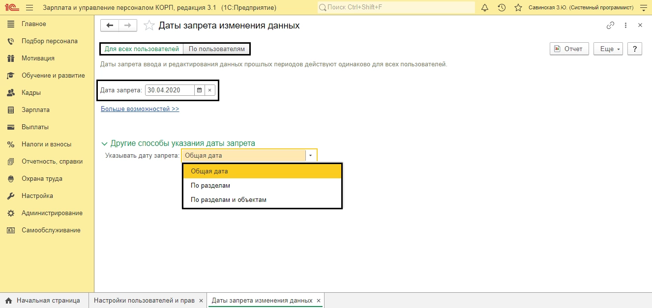 Установите дату запрета. Она может устанавливаться для всех пользователей или настраиваться для конкретных пользователей программы, общая или устанавливаться на определенные разделы или объекты учета.