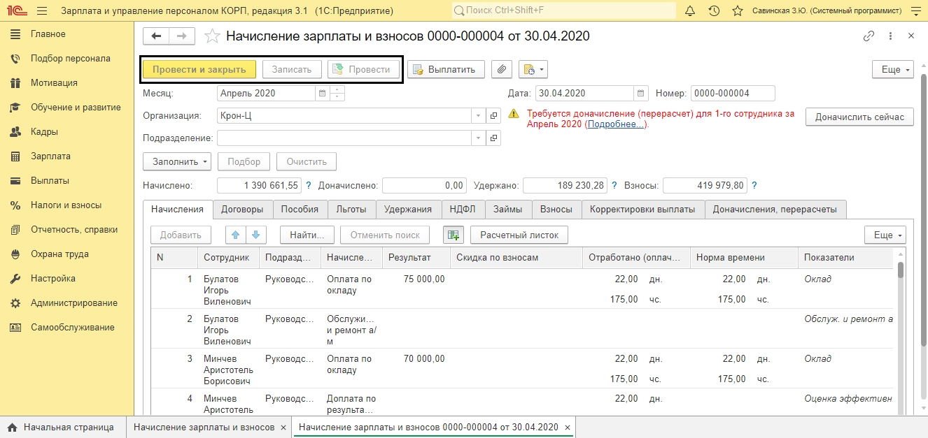 При вводе документа «Начисление зарплаты и взносов» в текущем месяце, программа увидела изменения «задним числом» и вывела предупреждение, о необходимости перерасчета.
