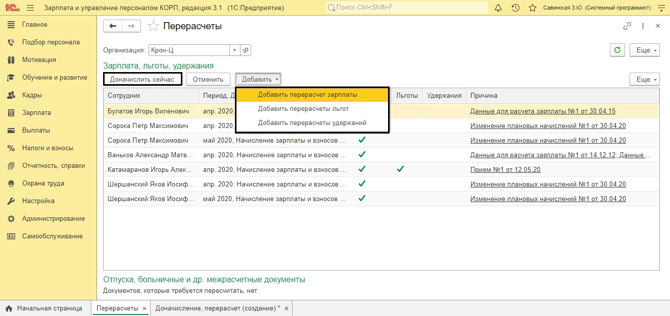 Чтобы выполнить зарегистрированный программой перерасчет нажмите кнопку «Доначислить сейчас».