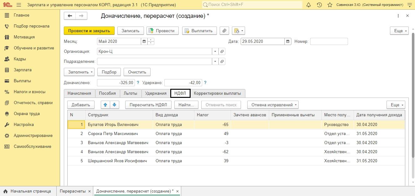 Перерасчет начислений, автоматически вызывает и пересчет НДФЛ по этим начислениям – вкладка «НДФЛ».
