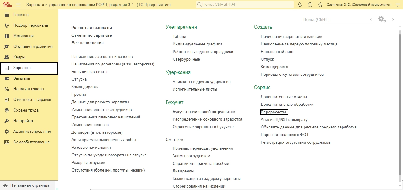 Перейдите в сервис «Перерасчеты», раздела «Зарплата».