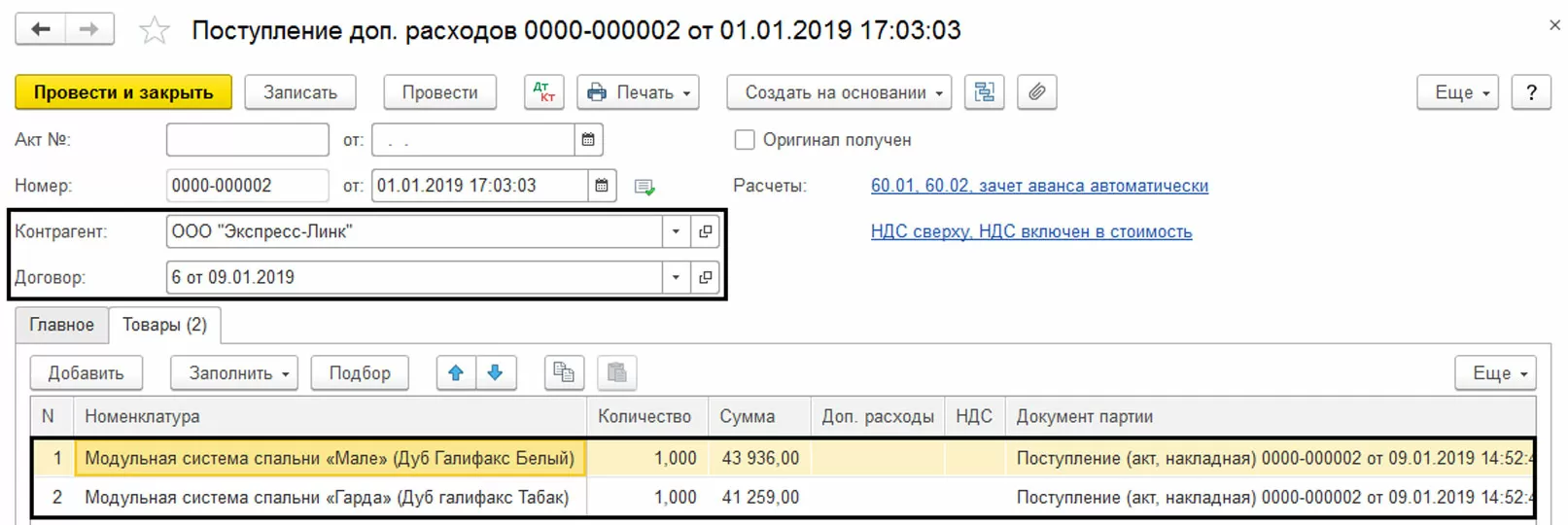 Заполняем данные о дополнительных расходах – сумму расходов, контрагента, договор.