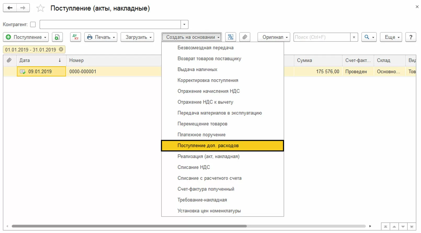 В число возможностей отображения допрасходов входит вариант отдельного специализированного документа, созданного из уже зафиксированного поступления. Чтобы «подтянуть» основание, в самом документе или в журнале документов «Поступление (акты, накладные)» находим одноименную кнопку. Нажав ее, выбираем команду «Поступление дополнительных расходов».