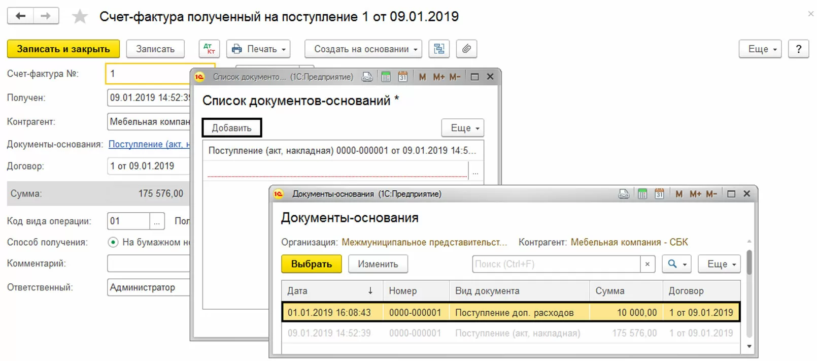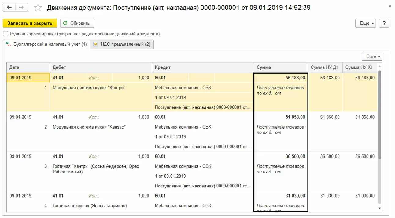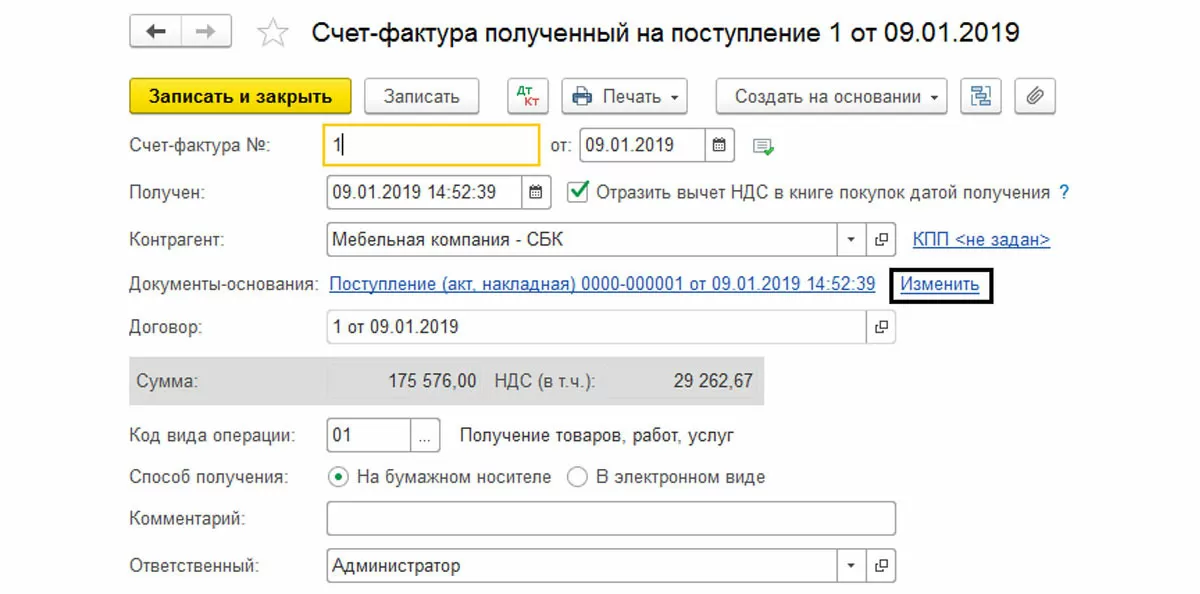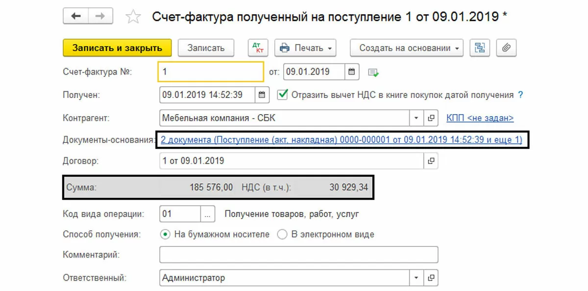 Итак, мы отразили наше поступление разными документами, сформировав при этом один счет-фактуру.