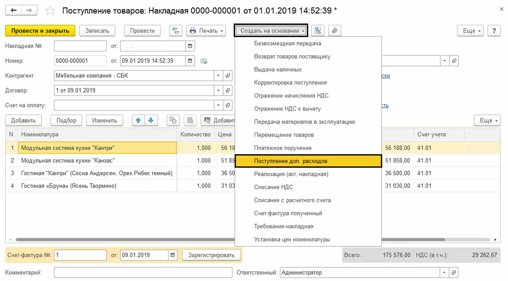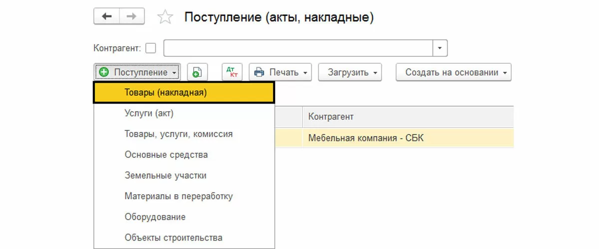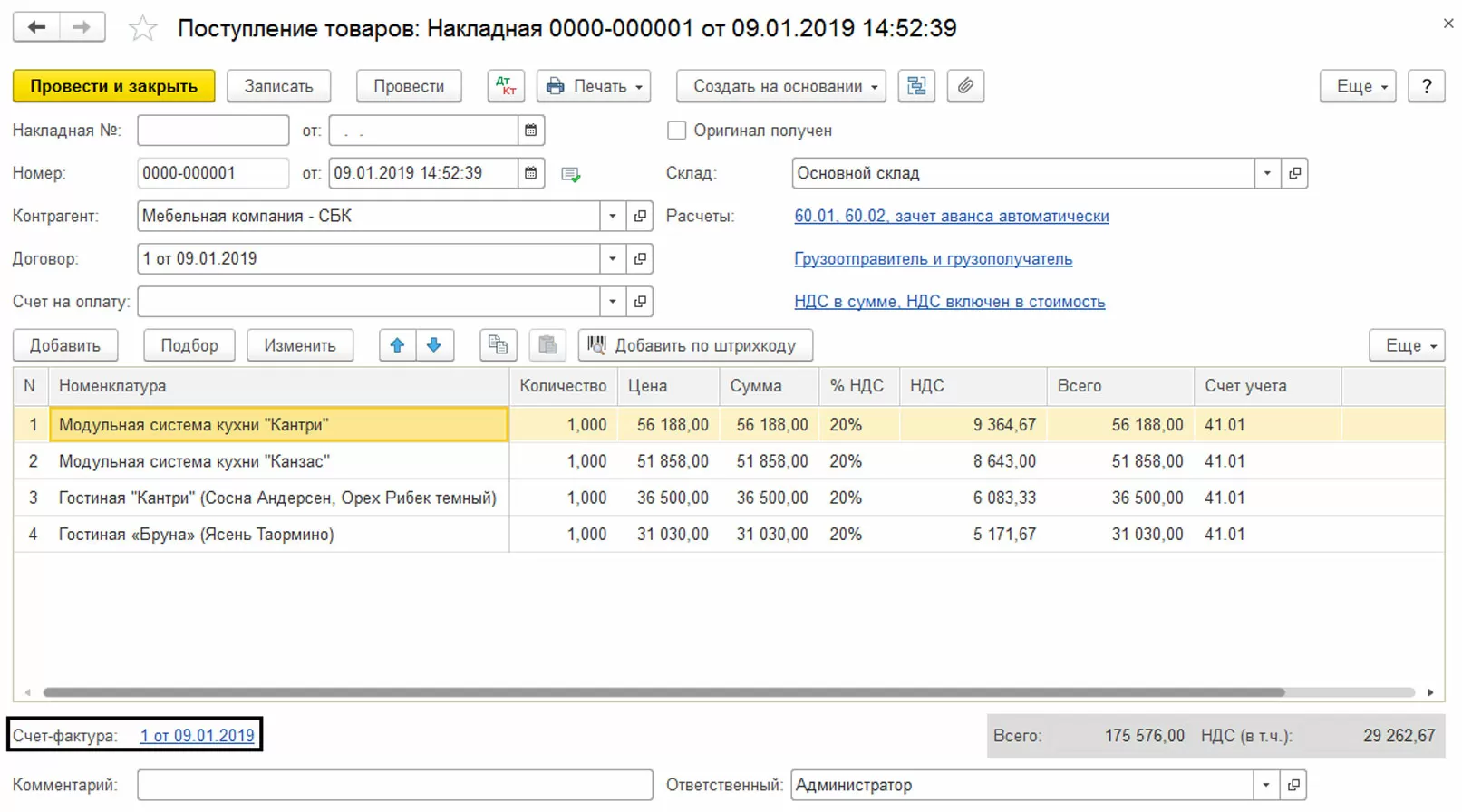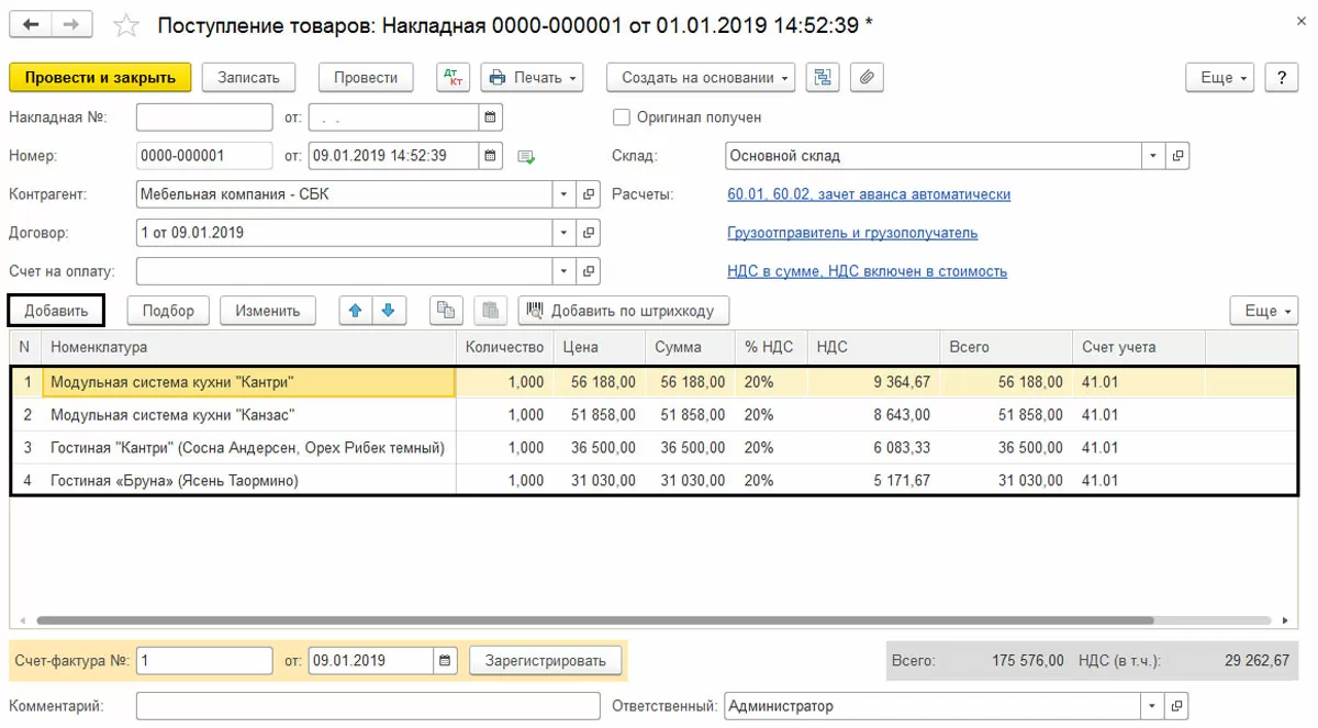 Отразим приобретение нашим торговым предприятием мебели у мебельной компании для реализации. Заполняем шапку документа согласно предоставленной накладной, указываем склад оприходования, через «Добавить» подбираем номенклатуру. Внизу регистрируем счет-фактуру и проводим документ.