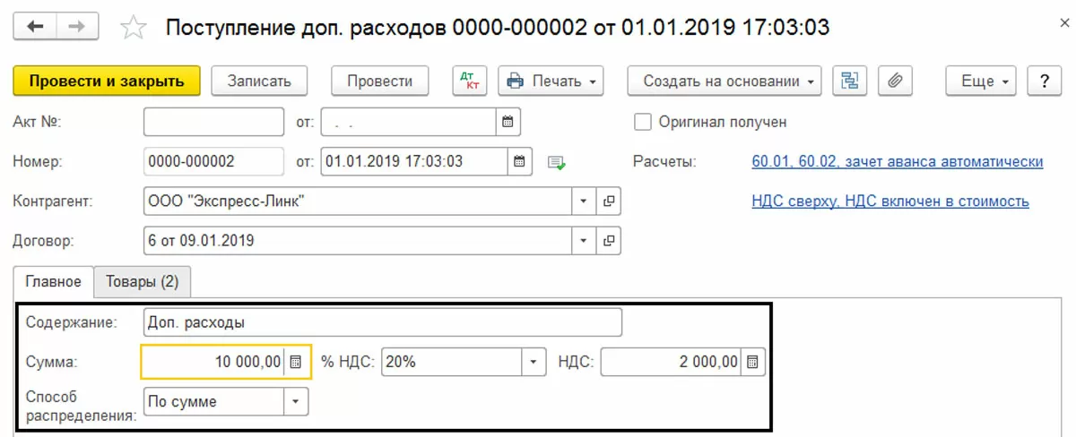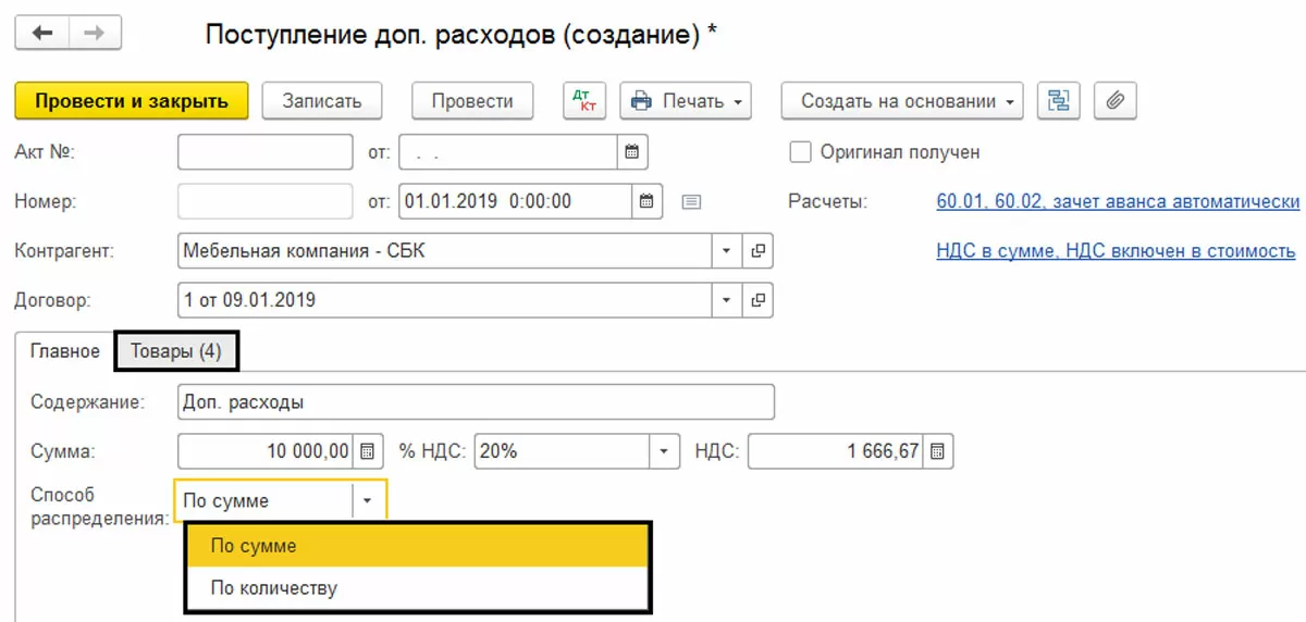 При таком способе ввода данные из документа основания попадают в создаваемый документ. В нашем примере, на закладке «Товары» отражается список поступивших ТМЦ, и нам остается только указать сумму дополнительных расходов, указав при этом один из способов распределения*.