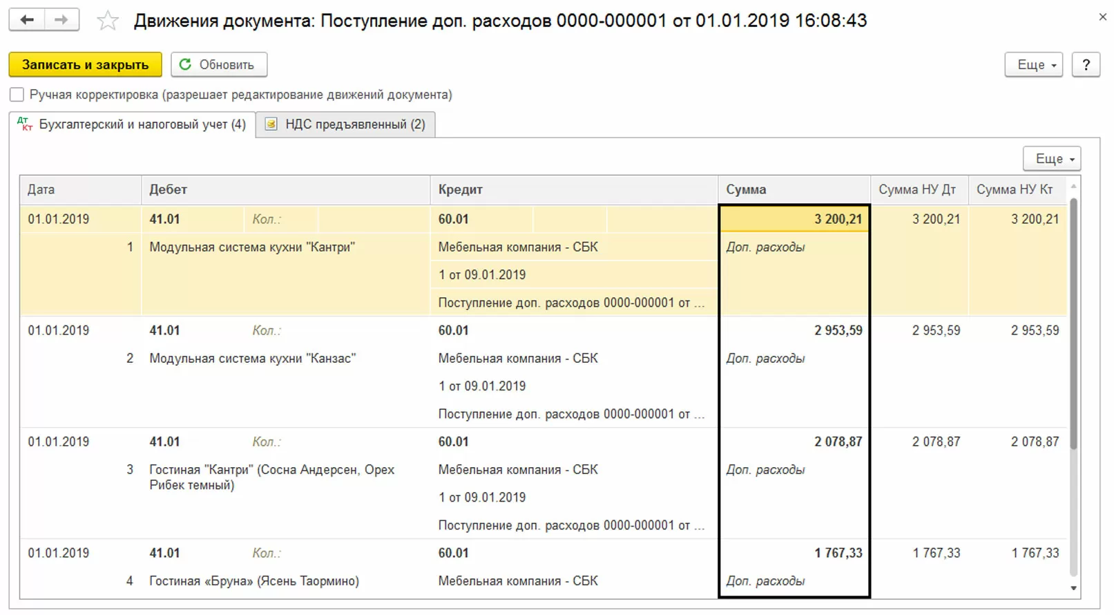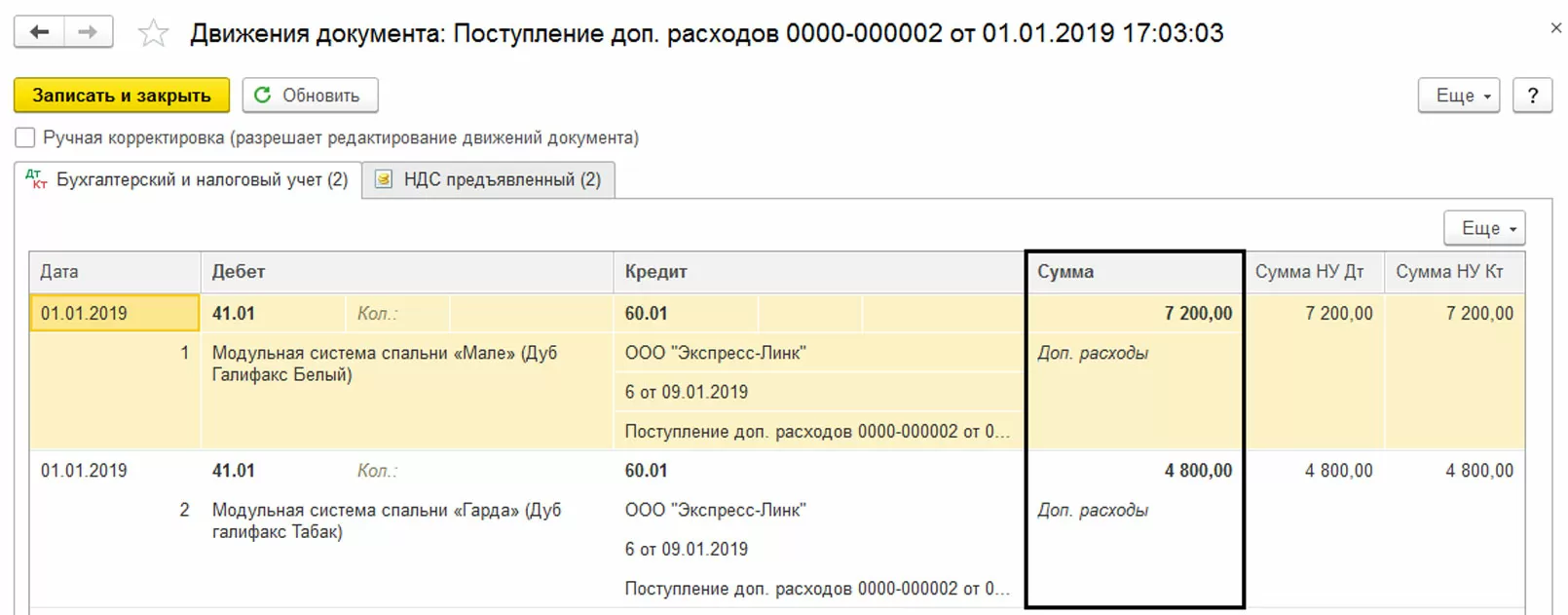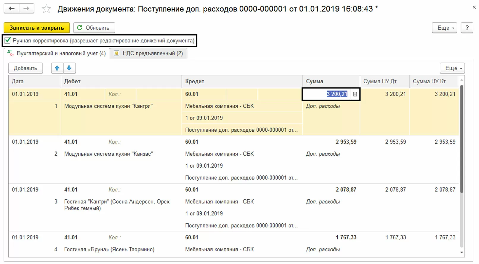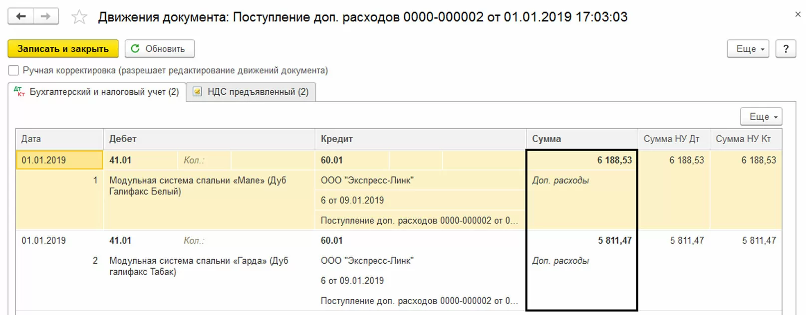 При необходимости и наличии прав на ручное редактирование регистров, установив галочку «Ручная корректировка», можно изменить суммы дополнительных расходов по своему усмотрению.