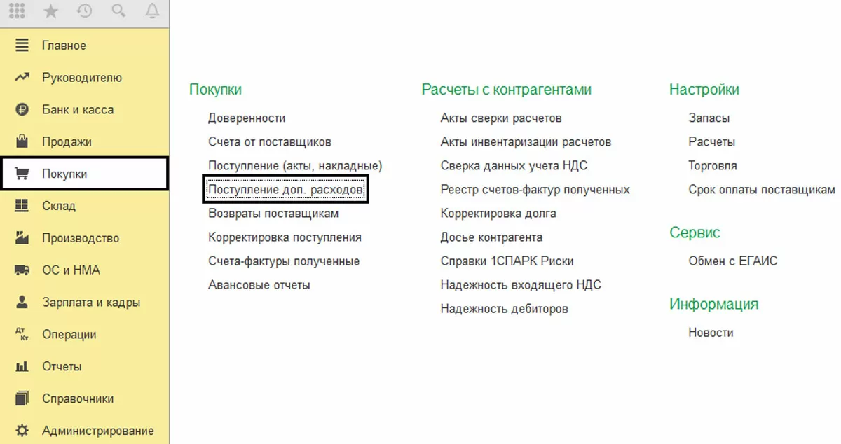 Создание документа «Поступление доп. расходов» из раздела «Покупки»