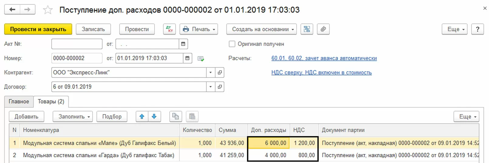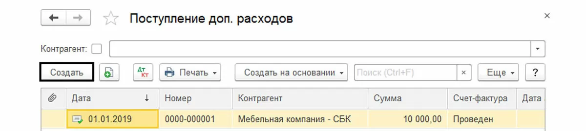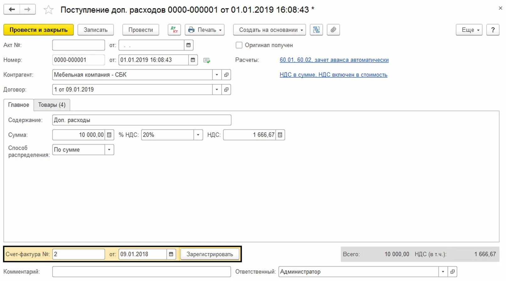 Если услуги по дополнительным расходам предоставлялись не поставщиком ТМЦ или им же, но с предоставлением отдельного счета-фактуры, такой счет-фактура регистрируется в документе «Поступление доп. расходов» в обычном порядке.