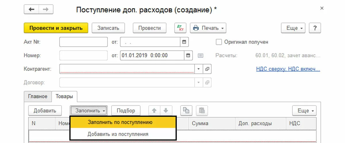 Создается пустой документ. Перейдя в закладку «Товары», по кнопке «Заполнить» можно выбрать документ поступления, по которому формируются доп. расходы, выбрав команду «Заполнить по поступлению» или «Добавить из поступления».