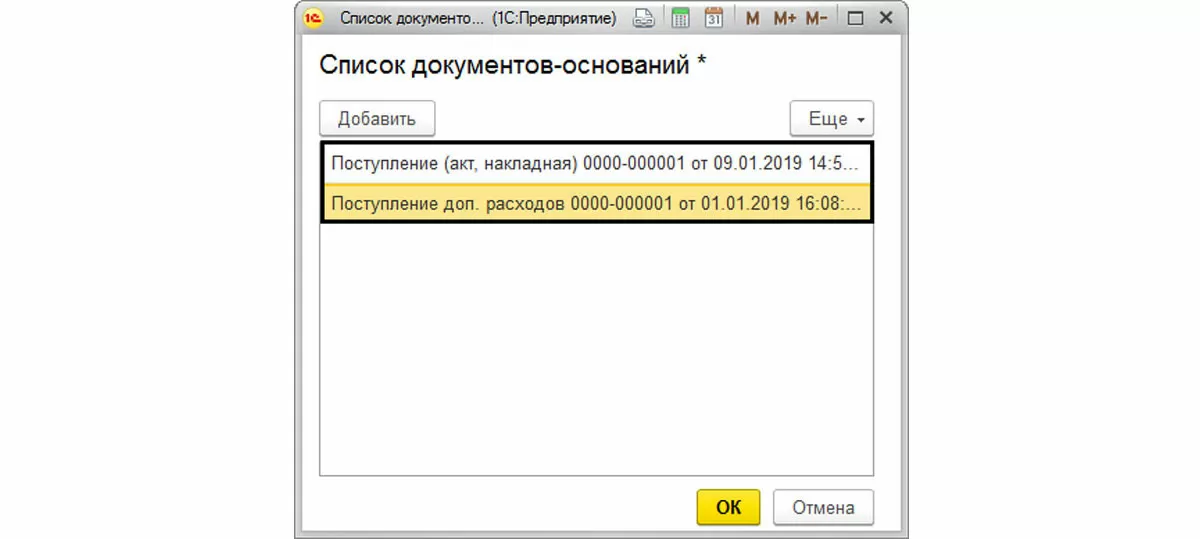 В открывшемся окне с помощью кнопки «Добавить» подбираем еще один документ-основание – «Поступление доп. расходов».