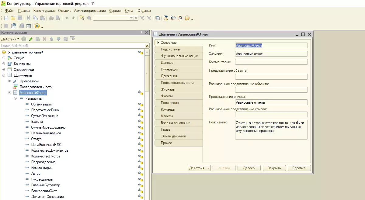 Для дополнительного документа можно назначить: реквизиты, табличные части, формы документа, форму списка, форму выбора, а также назначить нумератор и включить документ в какую-нибудь последовательность.