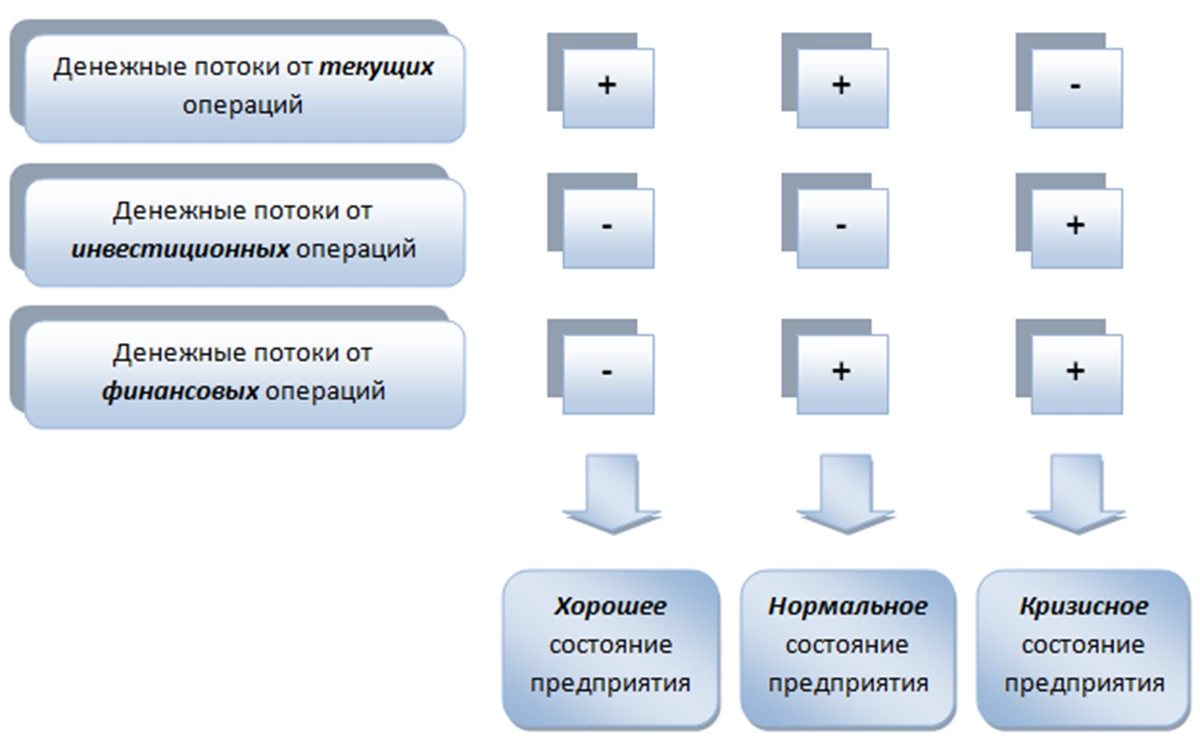 Когда масса чистого потока денег от текущих операций за отчетный период имеет значение в плюсе, а от инвестиционных и финансовых операций, соответственно, в минусе, то состояние фирмы признается хорошим. Когда движение денежных средств в результате текущих и финансовых операций за отчетный период уходит в плюс, а в результате инвестиционных операций – в минус, говорят о нормальном положении дел предприятия.