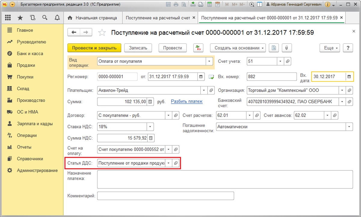Продемонстрируем вышеизложенное на примере. Предположим, посредством «Поступления на р/с» по статье движения «Поступление от продажи продукции и товаров, выполнения работ, оказания услуг» была зафиксирована оплата от покупателя в размере 102 135,00 рублей, в том числе НДС 15 579,92 рублей.