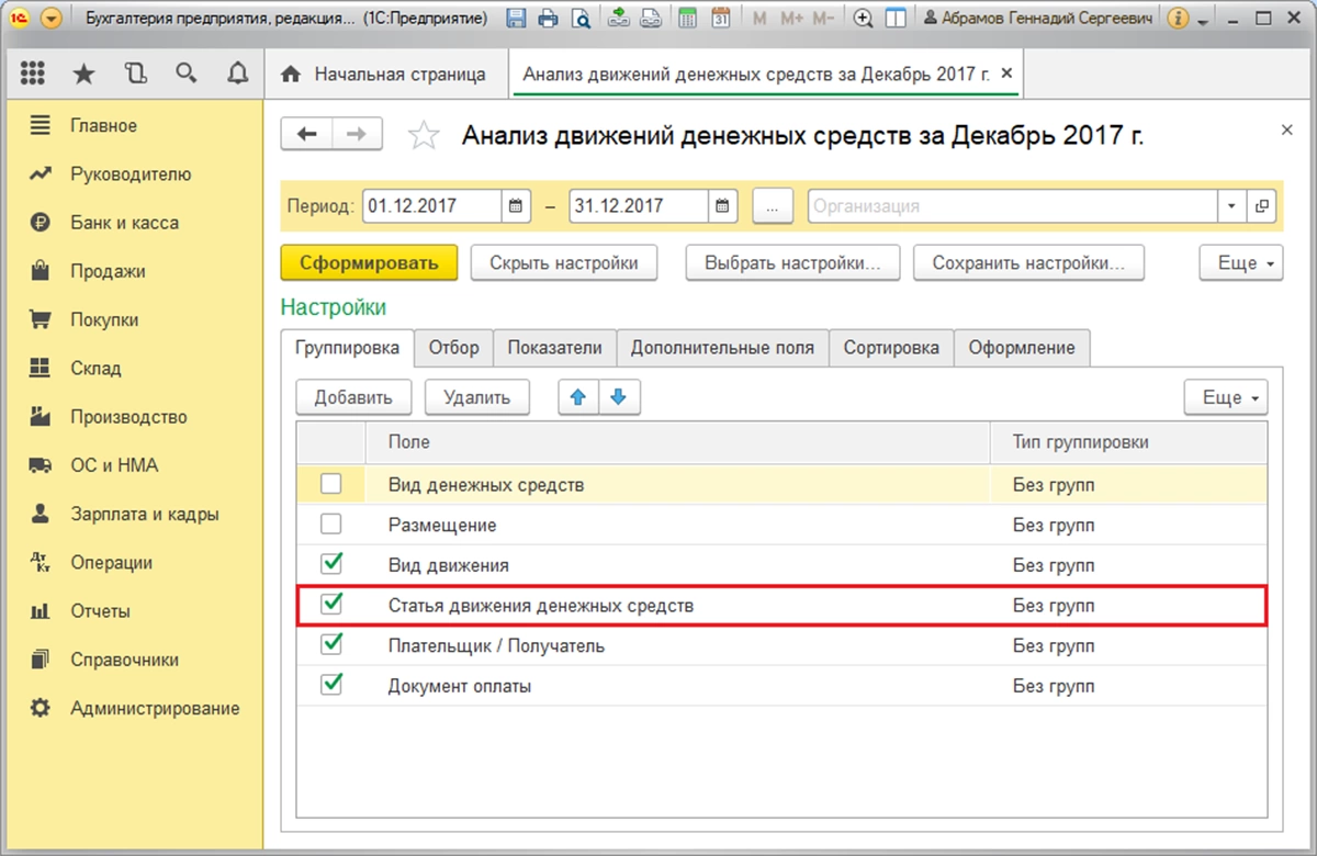 Чтобы сведения в отчете были сгруппированы по статьям ДДС, следует в настройках отчета на закладке «Группировка» установить флажок «Статья движения денежных средств». Настройки отчета скрыты под функциональной кнопкой «Показать настройки».