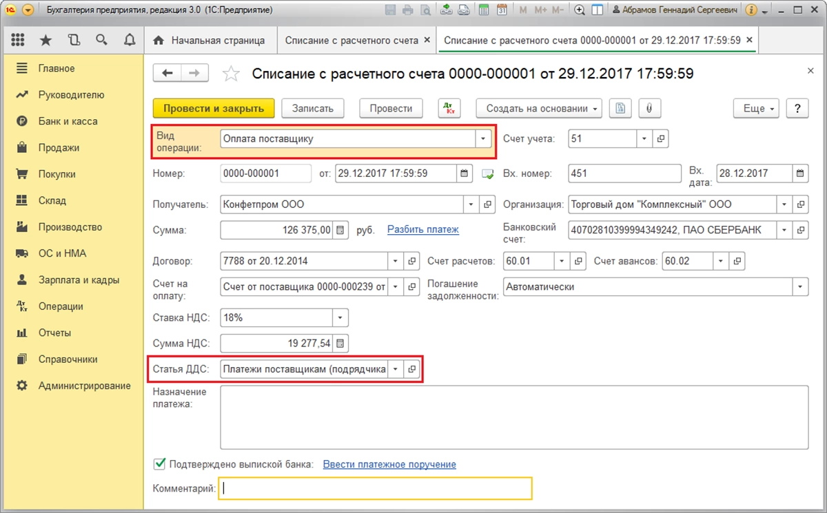 Созданные в справочнике статьи ДДС служат для заполнения реквизита «Статья ДДС» в документах программы. Например, в документах банка «Поступление на р/с» и «Списание с р/с» или кассы – приходный и расходный кассовые ордера.