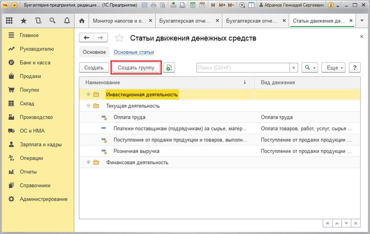 Поскольку финансовые потоки фирмы классифицируются по трем видам работ – повседневной, связанной с инвестированием, а также финансами, статьи ДДС в справочнике можно объединить в соответствующие группы. Для этого необходимо воспользоваться кнопкой «Создать группу».