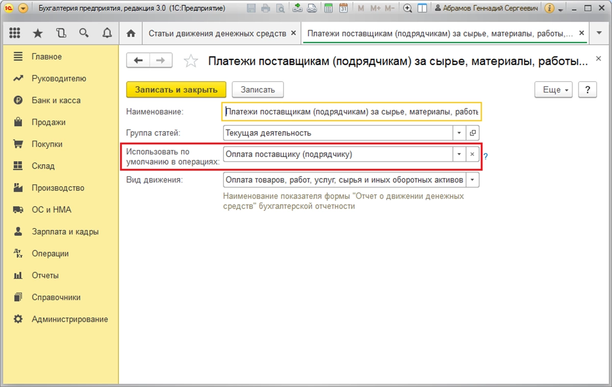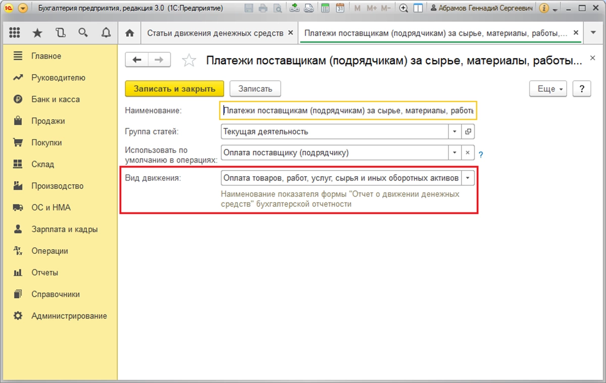 Справочник «Статьи движения денежных средств»