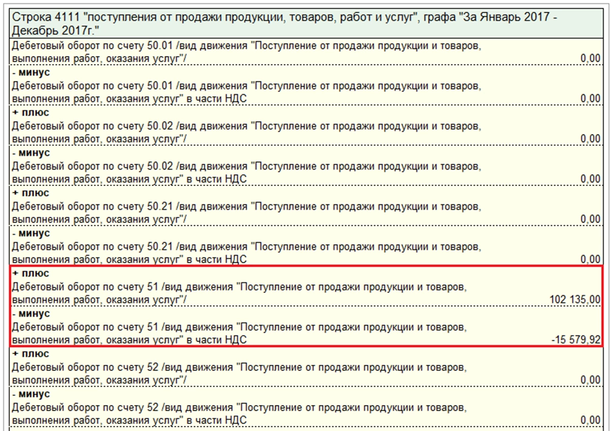 Расшифровка по строке 4111 позволяет увидеть составляющие итоговой суммы по данной строке. В нашем примере итоговая сумма 87 тыс. рублей была получена как разность между суммой оплаты от покупателя 102 135,00 рублей и НДС 15 579,92 рублей (86 555,08 ~ 87 тыс. рублей).