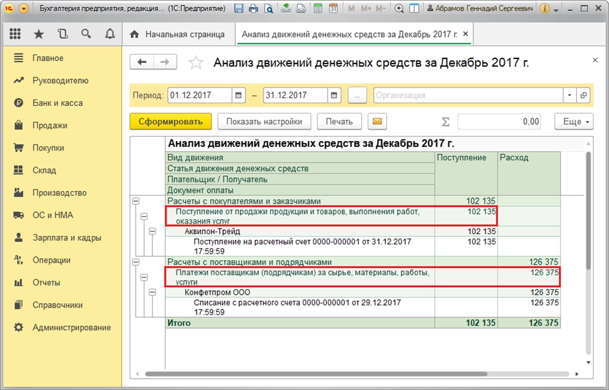 Отчет «Анализ движения денежных средств»
